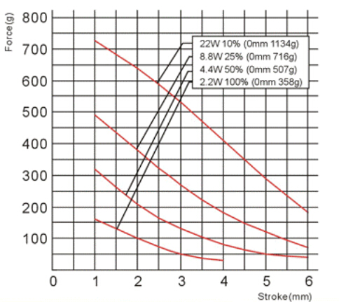 二、推拉電磁鐵U0730行程和力量曲線圖: